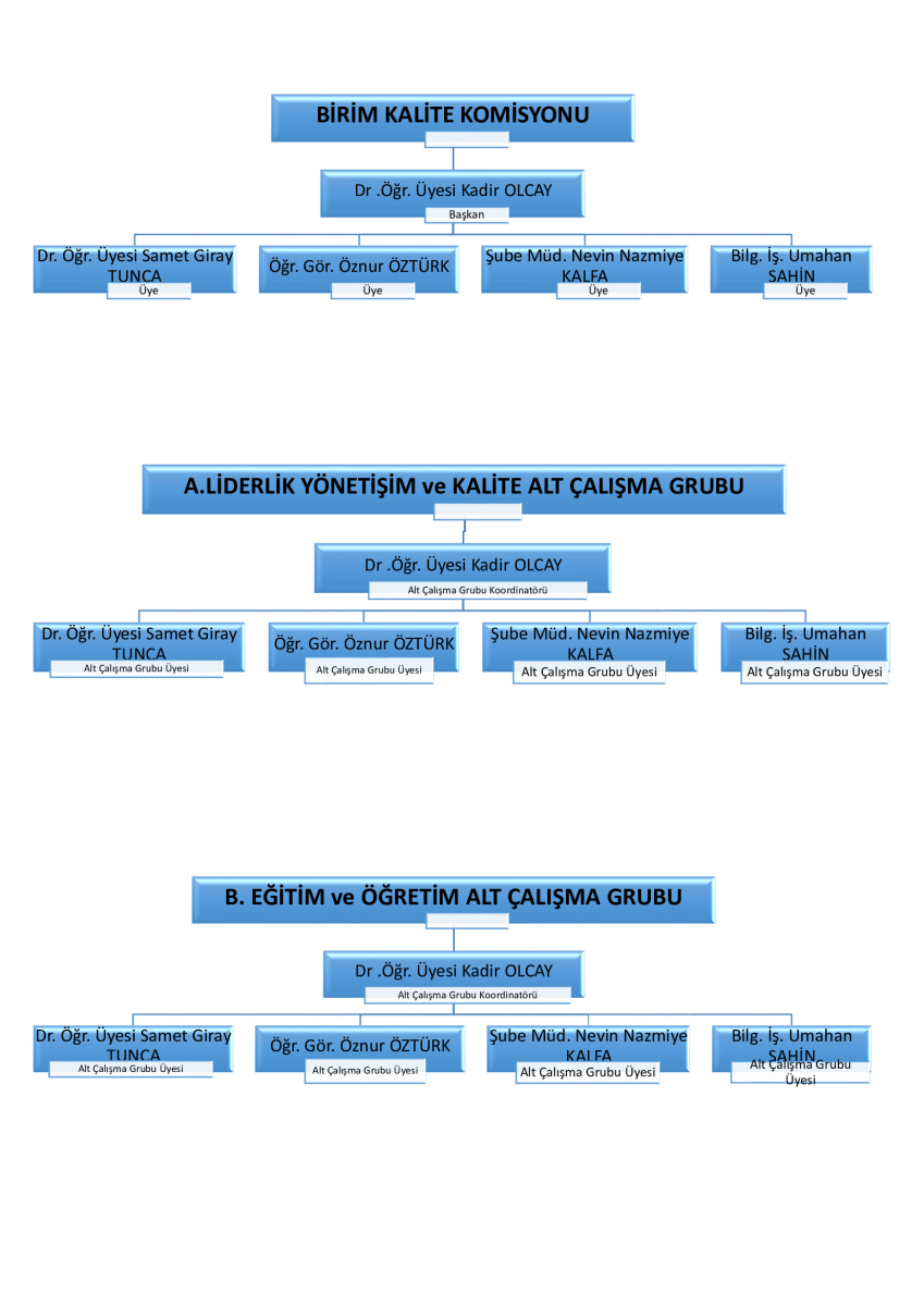Birim Kalite Komisyonu ile Alt Çalışma Komisyonları, Kütahya Dumlupınar Üniversitesi Kalite Güvencesi Yönergesi’nin 11. maddesinin 1, 2 ve 3. fıkraları uyarınca, Kütahya Dumlupınar Üniversitesi Sürekli Eğitim Uygulama ve Araştırma Merkezi Yönetim Kurulu’nun 15.04.2025 tarihli ve 01 sayılı kararı ile oluşturulmuştur.